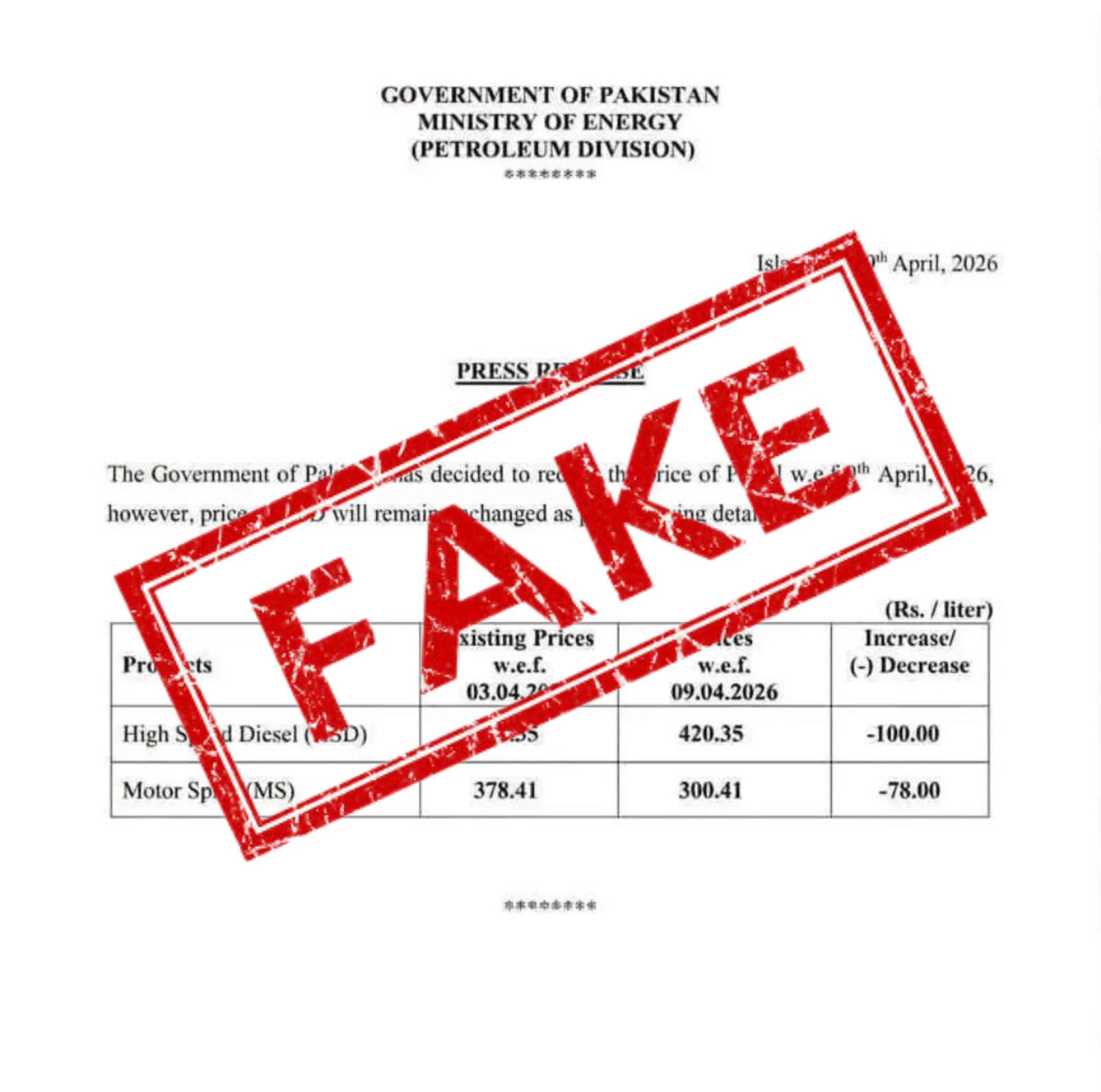 ISLAMABAD – Petroleum Division officially debunked viral notification circulating on social media that claims upton Rs100 cut in fuel prices effective April 9, 2026.