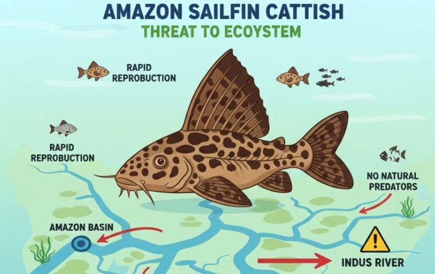 SUKKUR – A wave of alarm is sweeping through Pakistan’s fishing communities and environmental circles after sailfin catfish, a striking and colorful species native to South America’s Amazon River, was reportedly spotted in Indus River near Sukkur.