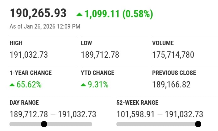 Around noon, KSE-100 index was trading at 190,521.41, climbing 1,354.59 points amid robust demand across automobile assemblers, cement, fertilizer, oil and gas exploration, OMCs, and power generation sectors.