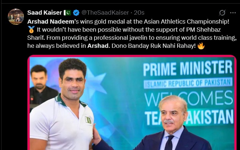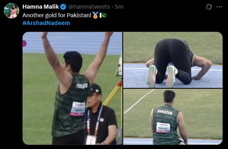 ISLAMABAD – Pakistan’s Olympic hero Arshad Nadeem lit up the Asian Athletics Championship on Saturday with a commanding gold-medal throw of 86.40 meters in men’s javelin final. But beyond the stadium, it was social media that truly captured candid moments of Pakistan’s Golden Boy.