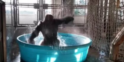 Splashing spinning gorilla in Dallas zoo